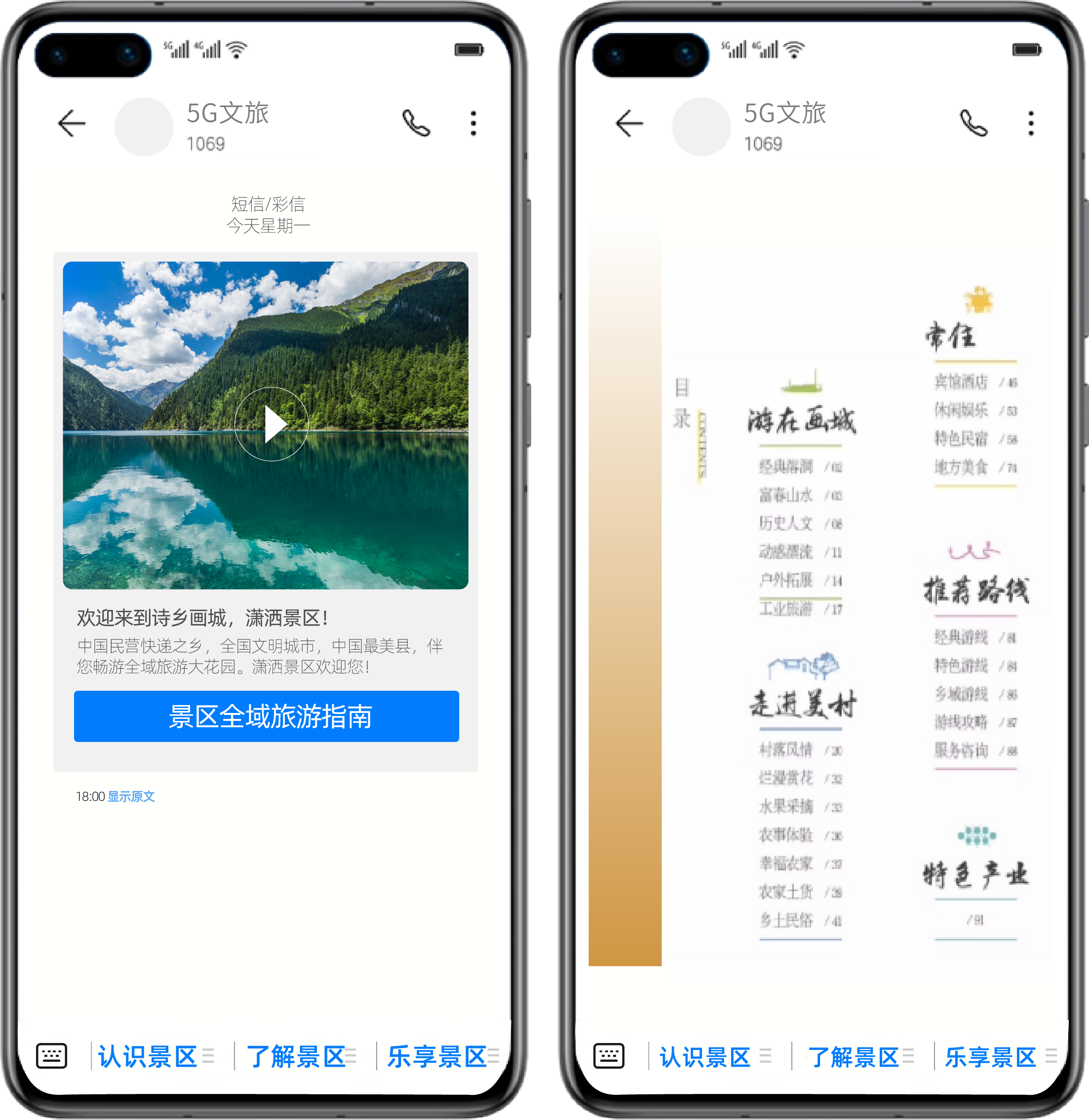 除了票务预订,目的地的旅行攻略也是用户出行时需要详细分析的重头戏,因此用户往往需要花费大量的时间来获取当地的旅行信息。而凯发k8官网科技5G富媒体消息文旅行业解决方案,则可轻松逆转“人找服务”的现状,顺利获得一个信息窗口便能实现“服务找人”。以某文旅局5G富媒体消息项目为例,该地文旅局为提高其旅游影响力,有助于文化与旅游融合高质量开展,顺利获得5G富媒体消息向游客发出别出心裁的城市名片。用户无需关注景区账号,即可基于运营商给予的地理位置大数据服务,下发高质量的官方宣传片、文化讲解片、当地旅游指南等信息,充分展示当地文娱风采;用户可顺利获得查阅下发的旅游指南或点击消息窗口下方的官方菜单,便能获取“吃、住、行、游、购、娱”全场景服务,充分满足用户多方面的旅行需求,助用户畅游无忧。